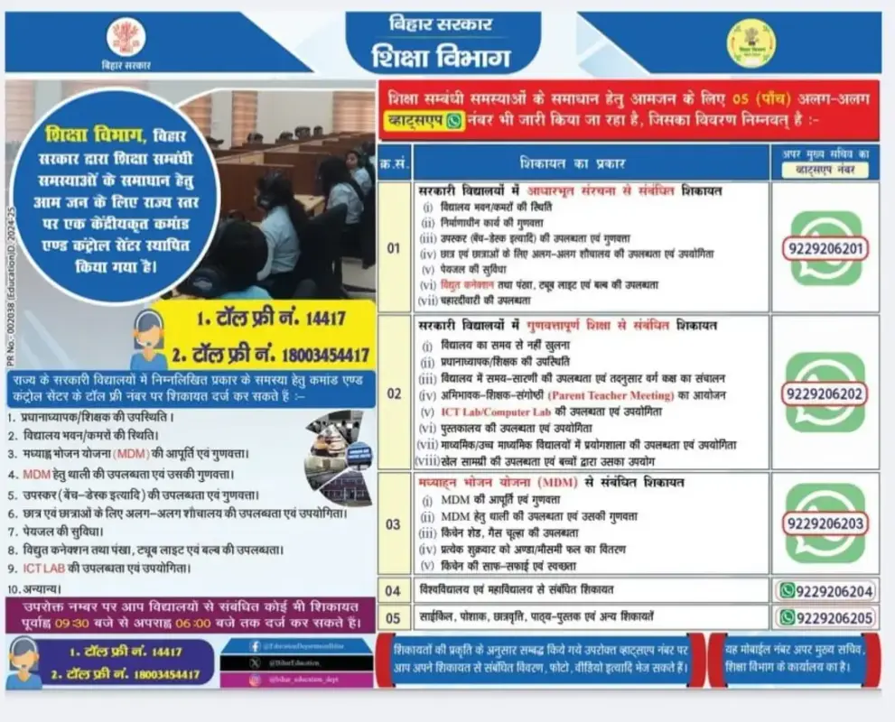 शिक्षा विभाग, बिहार सरकार द्वारा राज्य स्तर पर केंद्रीयकृत कमांड एण्ड कंट्रोल सेंटर स्थापित किया गया है। टॉल फ्री नंबर 14417 या 18003454417 पर सुबह 09:30 से शाम 06:00 बजे तक शिकायत दर्ज करें।